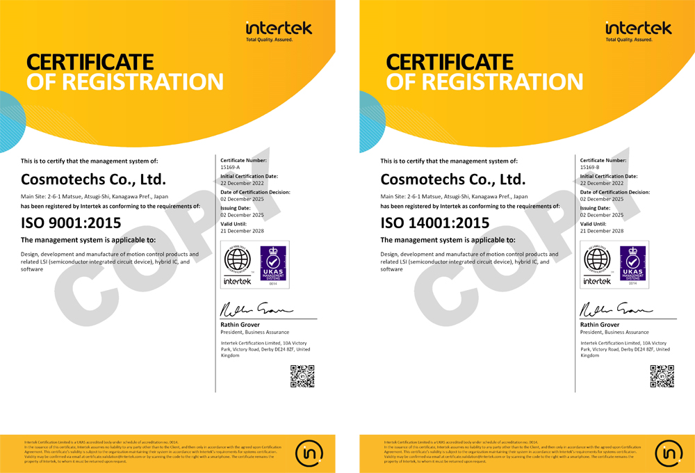 当社は、品質と環境に関する国際標準規格『ISO9001』・『ISO14001』を取得しております。